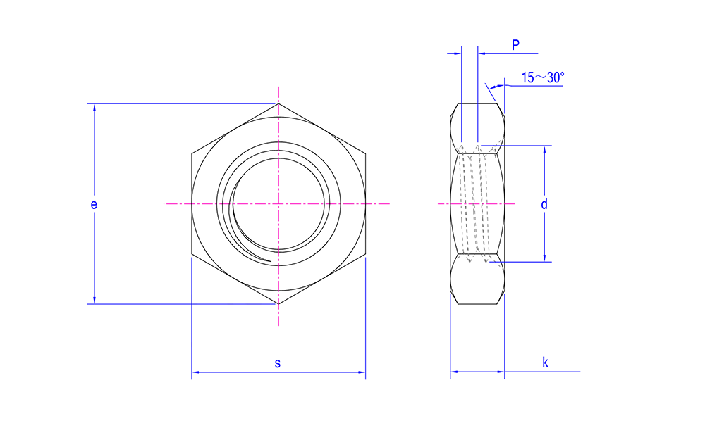 | Utseendeegenskaper | Form: Sexkantig med sex symmetriska sidor, vilket möjliggör enkel åtdragning och borttagning med en skiftnyckel eller andra verktyg. Denna design ger bättre driftsbekvämlighet i trånga utrymmen. Tjocklek: Jämfört med vanliga sexkantsmuttrar är den tunnare, klassad som en tunn mutter. Den är relativt lätt och tar mindre plats. Ytbehandling: Behåller typiskt den naturliga färgen i rostfritt stål med en metallisk lyster. Den kan också genomgå passivering, polering eller andra ytbehandlingar efter behov för att förbättra korrosionsbeständigheten och estetiken. |