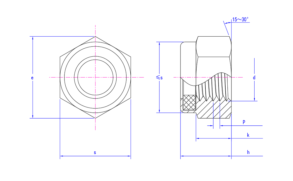 | Fördelar och funktioner | Invändigt med inlägg av icke-metalliskt material, såsom nylonringar, för att förbättra friktionen och låskraften Används för att fästa anslutningar för att förhindra lossning och vibrationer |